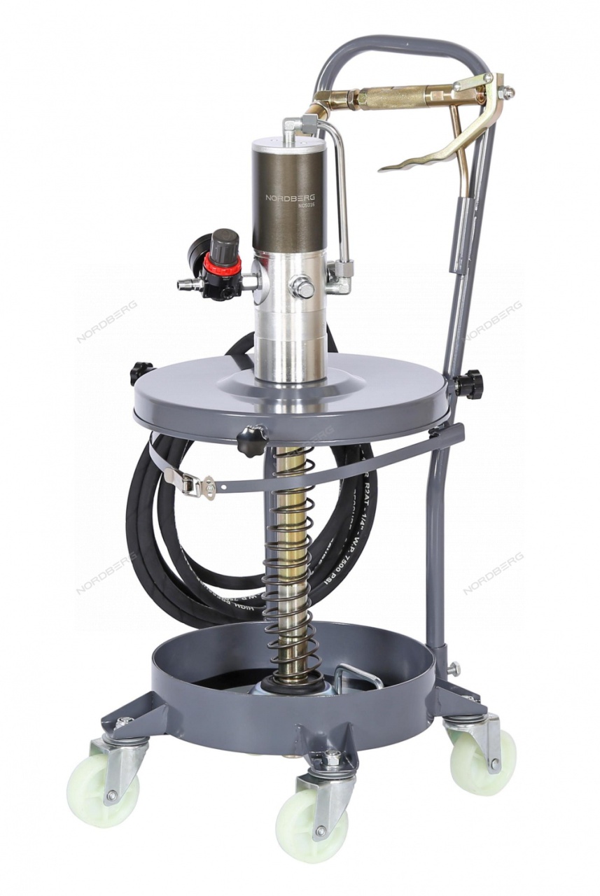 Пневматическая установка для раздачи густой смазки из бочек NORDBERG NO5016 – специальное оборудование для обслуживания узлов и агрегатов в автосервисах, транспортных и других предприятиях, занимающихся обслуживанием и ремонтом транспортных средств и другого оборудования.