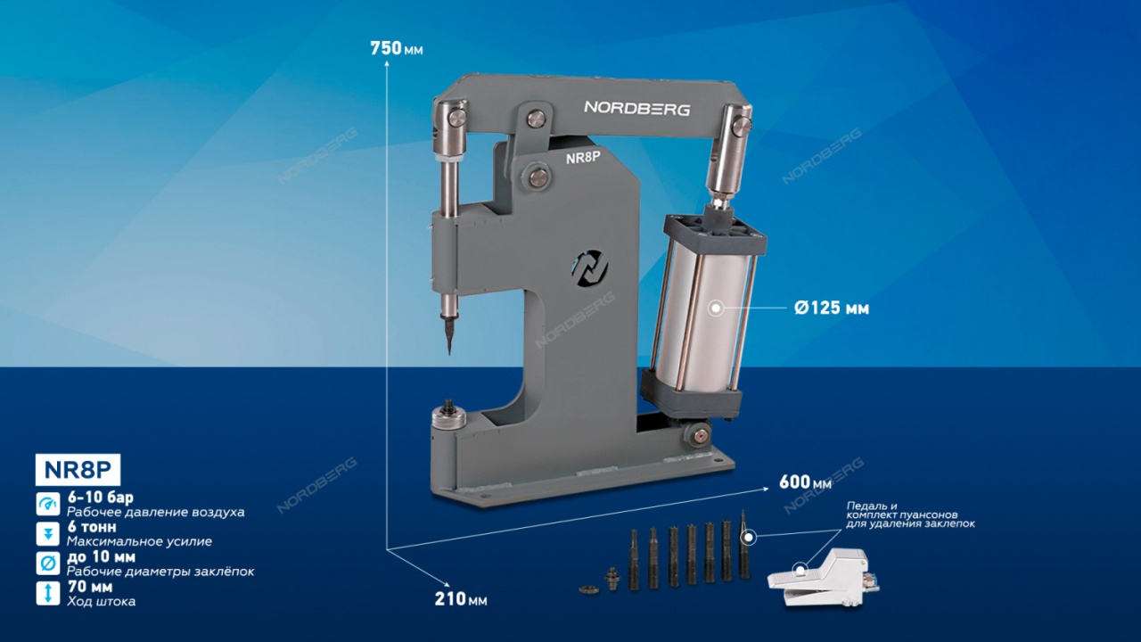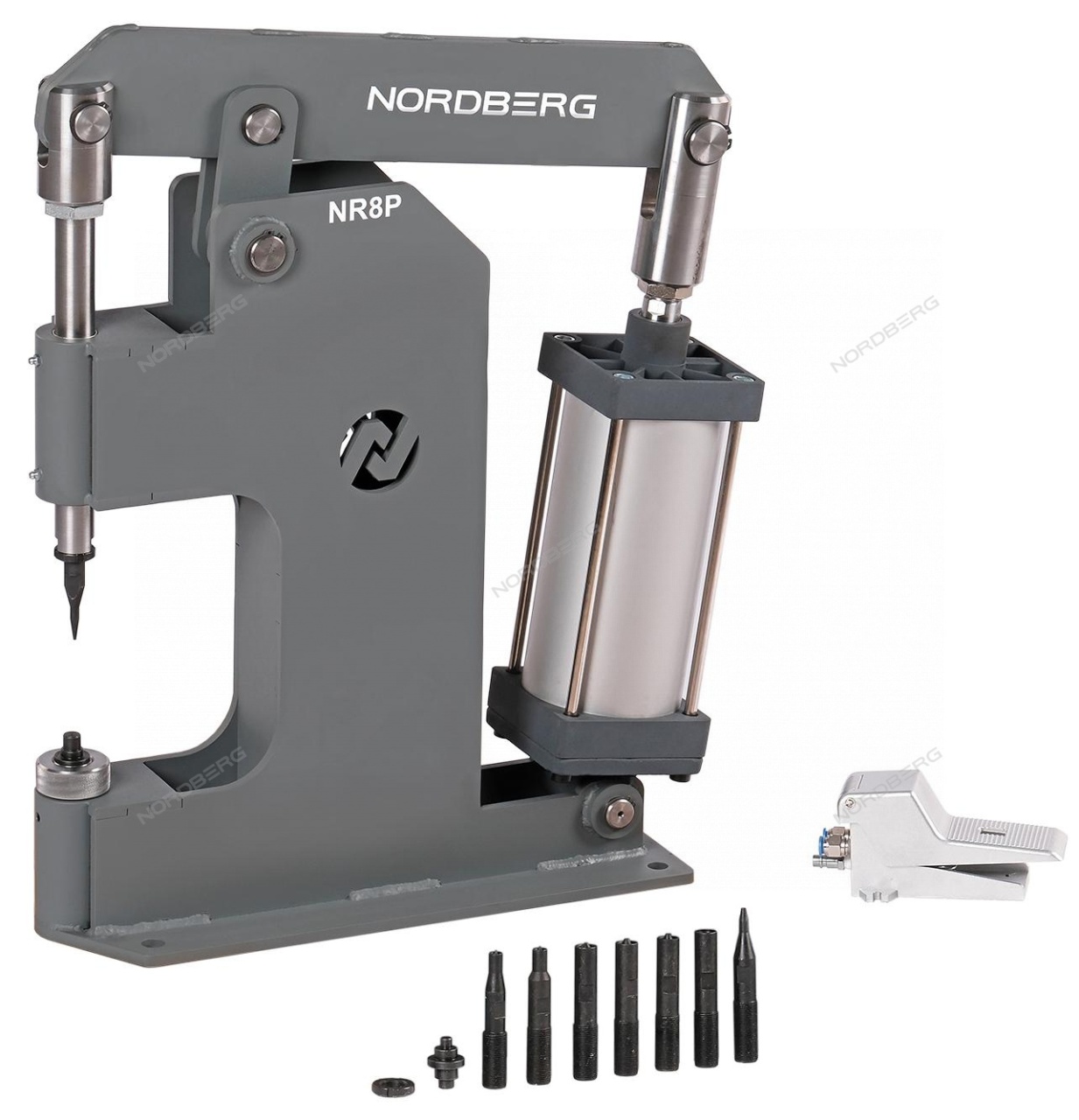 Настольный пневматический станок Nordberg предназначен для установки и удаления стальных, алюминиевых и медных заклепок диаметром до 10 мм при замене накладок на тормозных колодках и дисках сцепления. Применяется в автосервисах, автомастерских, на СТО и т.д.