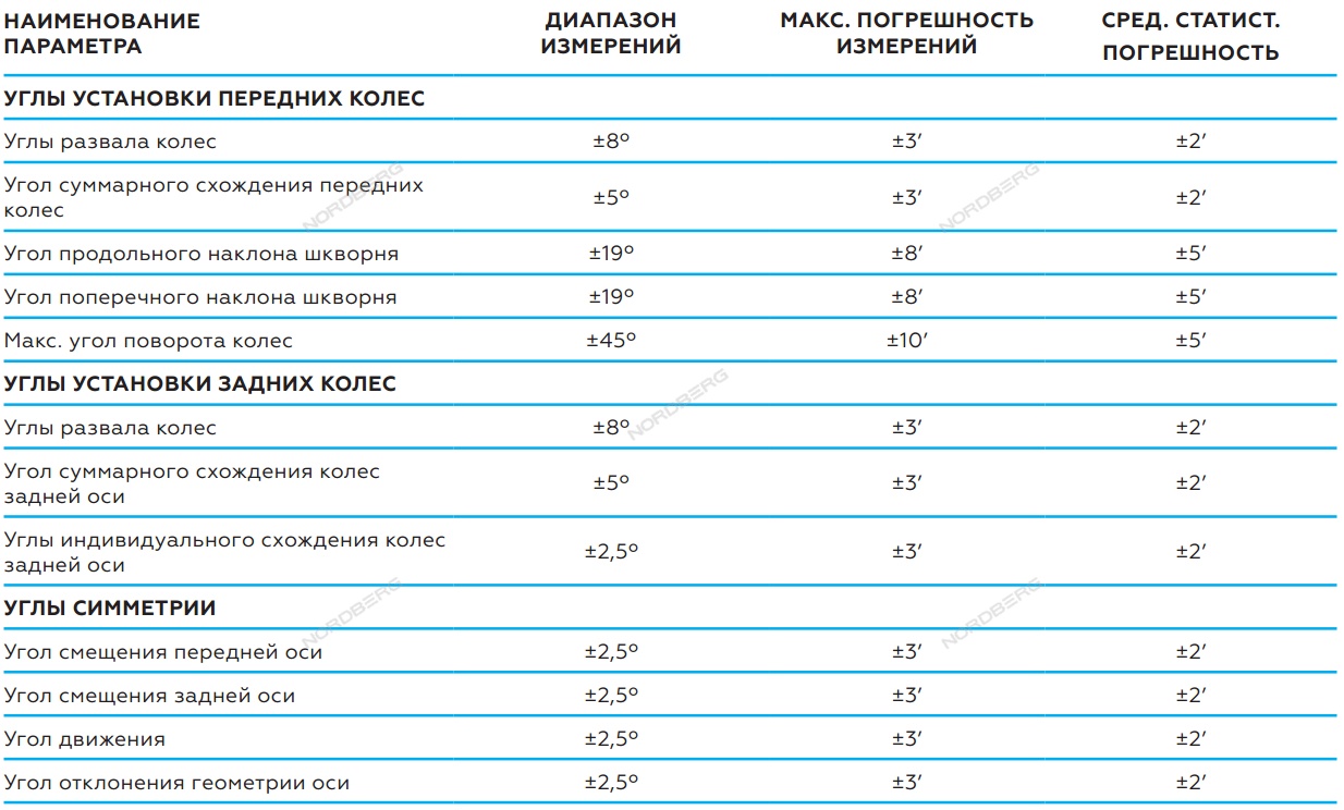 • Измерения максимального угла поворота колес без электронных поворотных кругов;