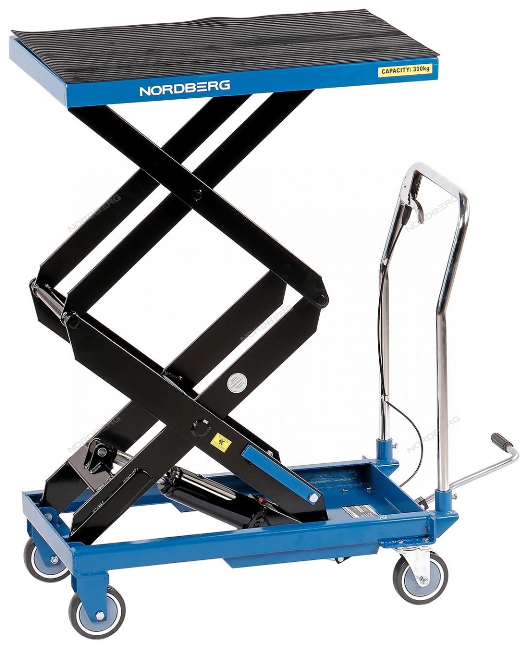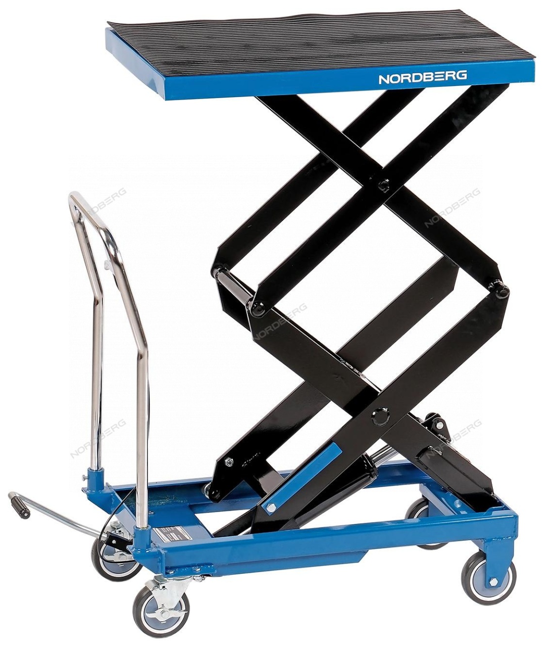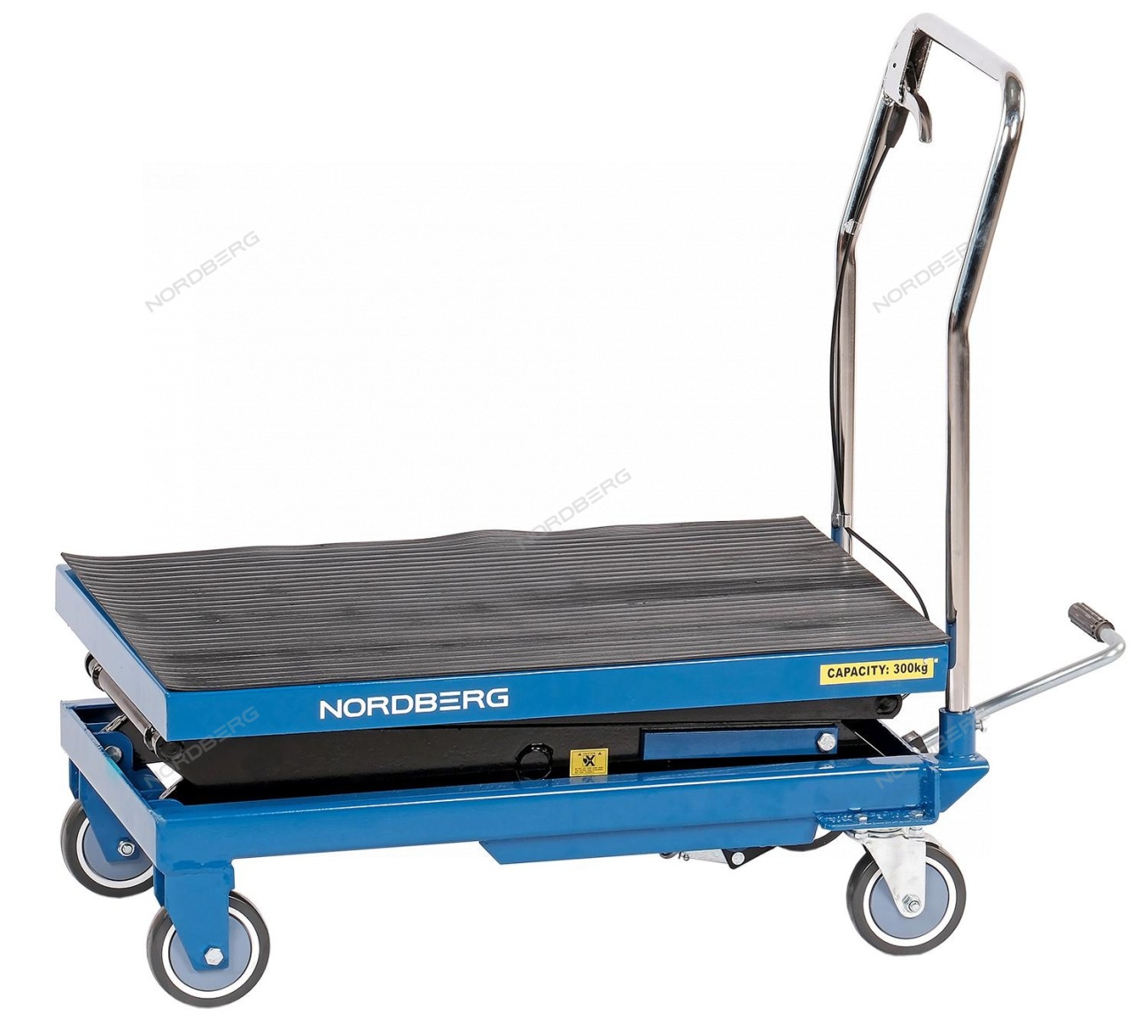 Гидравлический подъемный стол-тележка Nordberg грузоподъемностью 300 кг совмещает в себе функции стационарного подъемного стола для приподнимания различных грузов и ручной платформенной тележки для их перемещения по территории производственного цеха, авторемонтного предприятия, складского и других помещений.