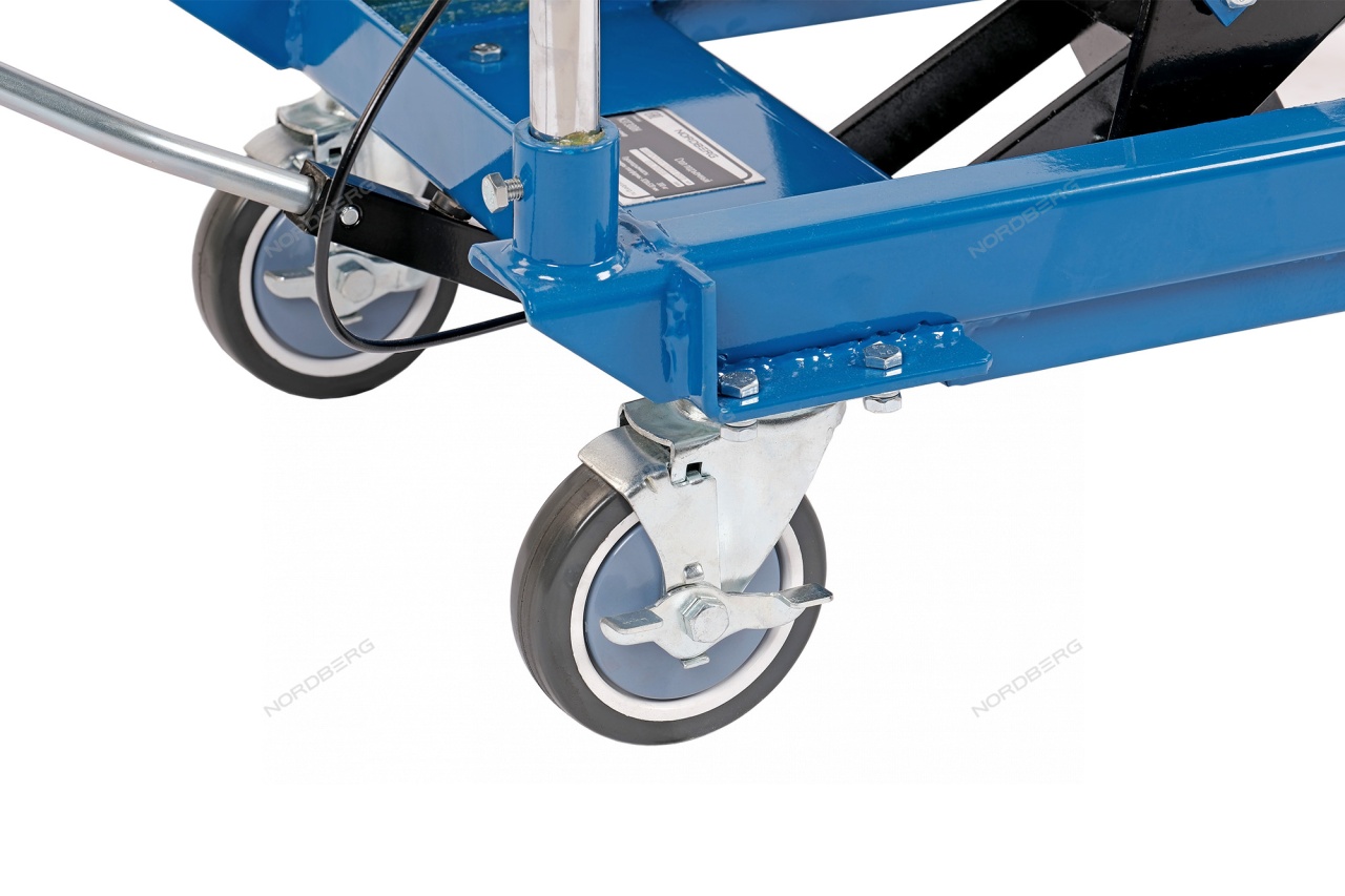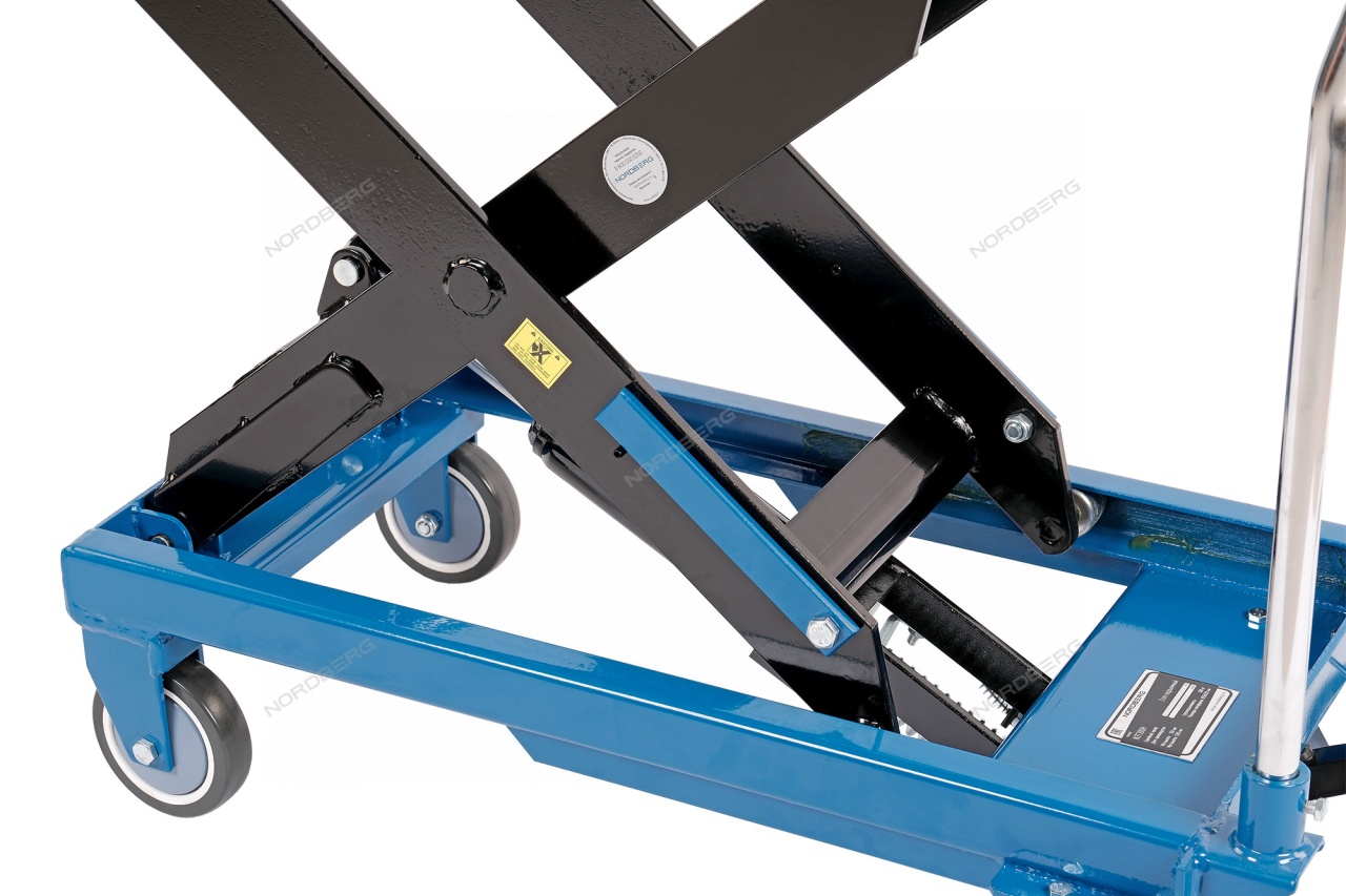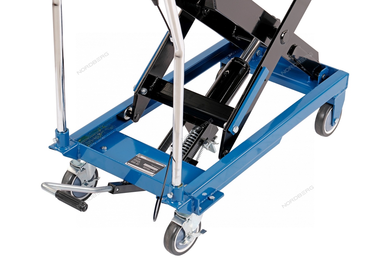 Гидравлический подъемный стол-тележка Nordberg грузоподъемностью 300 кг совмещает в себе функции стационарного подъемного стола для приподнимания различных грузов и ручной платформенной тележки для их перемещения по территории производственного цеха, авторемонтного предприятия, складского и других помещений.