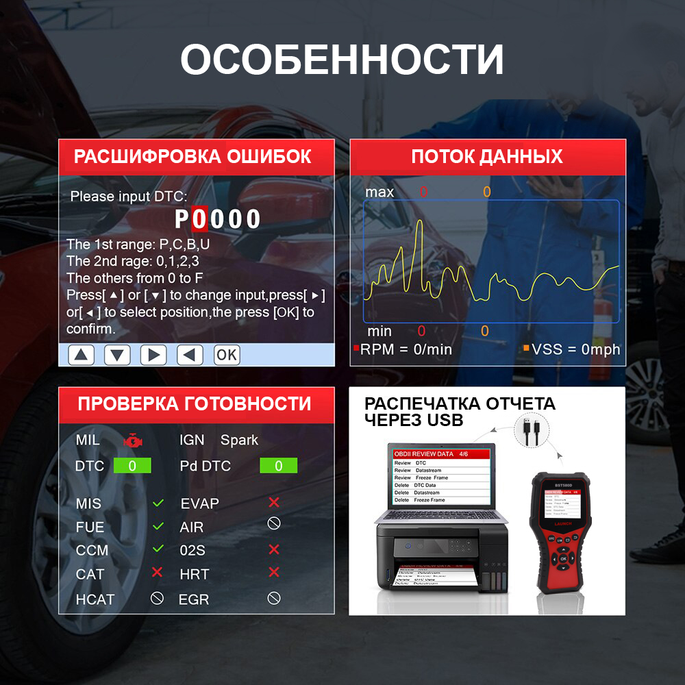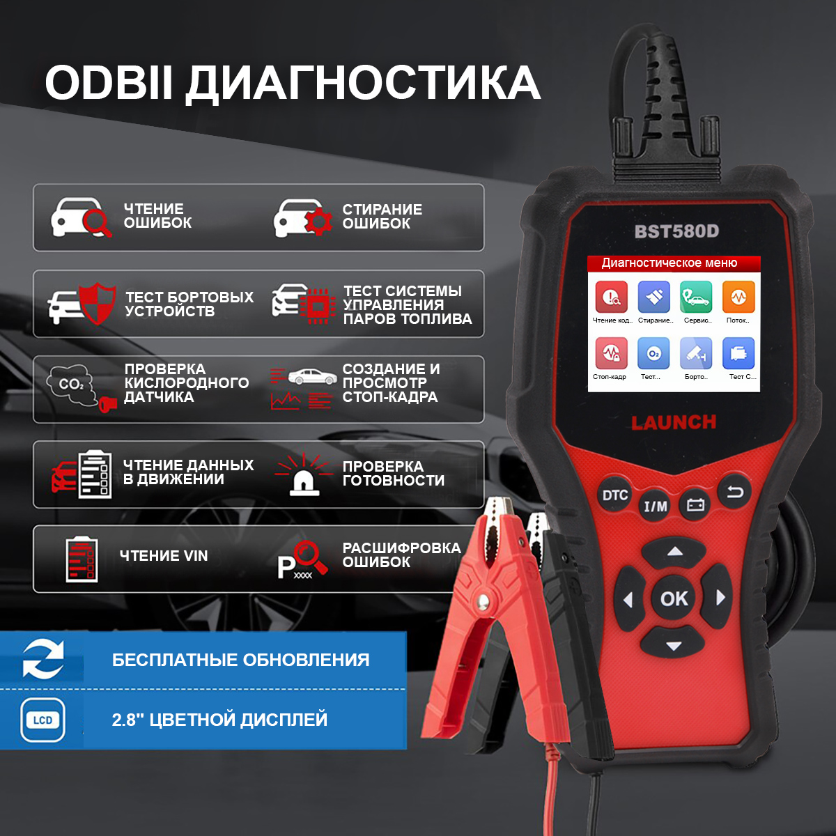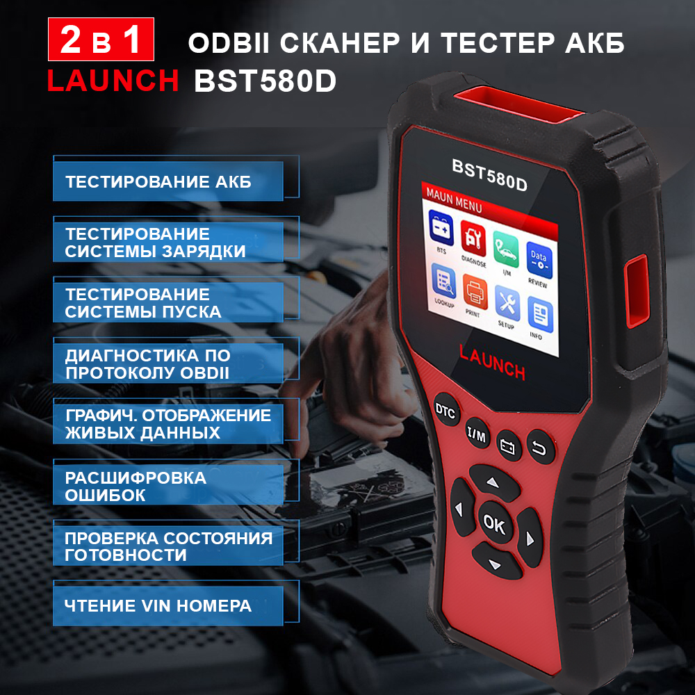 Launch BST580D — это профессиональный инструмент, объединяющий в себе функции тестера АКБ и диагностического сканера OBD.