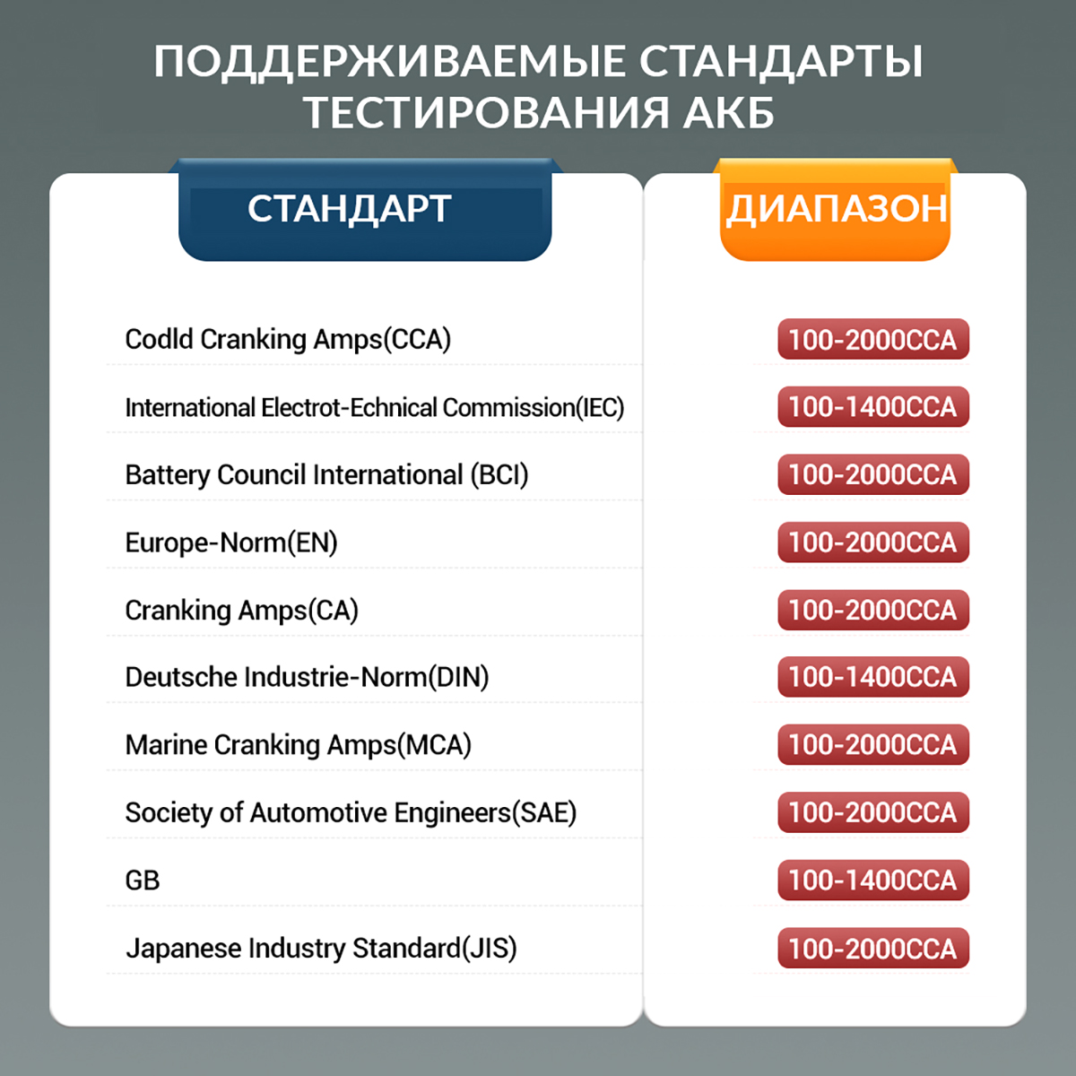 Поддерживаемые стандарты АКБ - CCA, BCI, CA, MCA, JIS, DIN, IEC, EN, SAE, GB