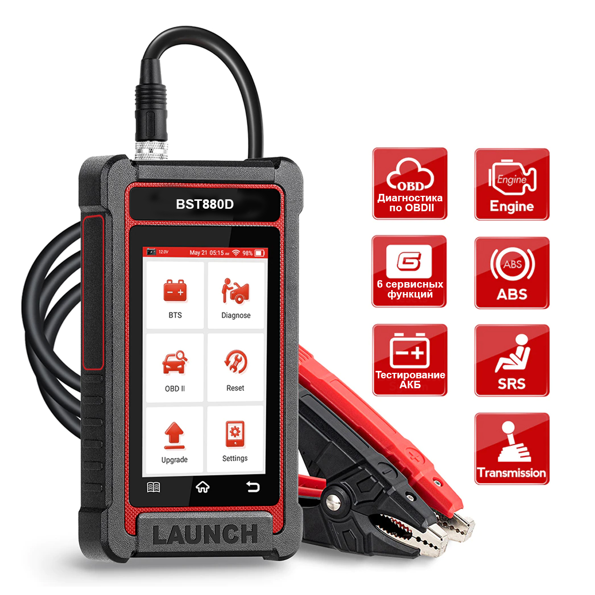 Launch BST880D - это многофункциональный тестер 2в1 с сенсорным управлением. Он объединяет в себе тестер аккумуляторных батарей и диагностический сканер. С его помощью вы не только проверите 12В АКБ, но и системы пуска и зарядки, продиагностируете любой автомобиль по протоколу OBDII и системы Engine, AT, SRS, ABS. а так-же проведет сервисное обслуживание благодаря 6-ти сервисным функциям. Данный тестер будет идеальным помощником для обслуживания личных авто или в зоне приемки.