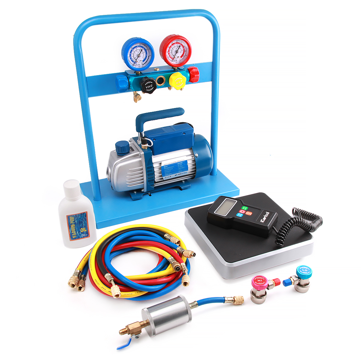 Установка создана на базе 4-х вентильного коллектора и вакуумной помпы. В зависимости от модели, установка комплектуется одноступенчатой или двухступенчатой вакуумной помпой с производительностью 60 л/мин. В комплект также входят 4 заправочных шланга различной длины ( 3м - 2шт., 1,5м - 1шт., 0.5м - 1 шт.). Для удобства транспортировки и хранения все компоненты установки установлены на металлической раме.