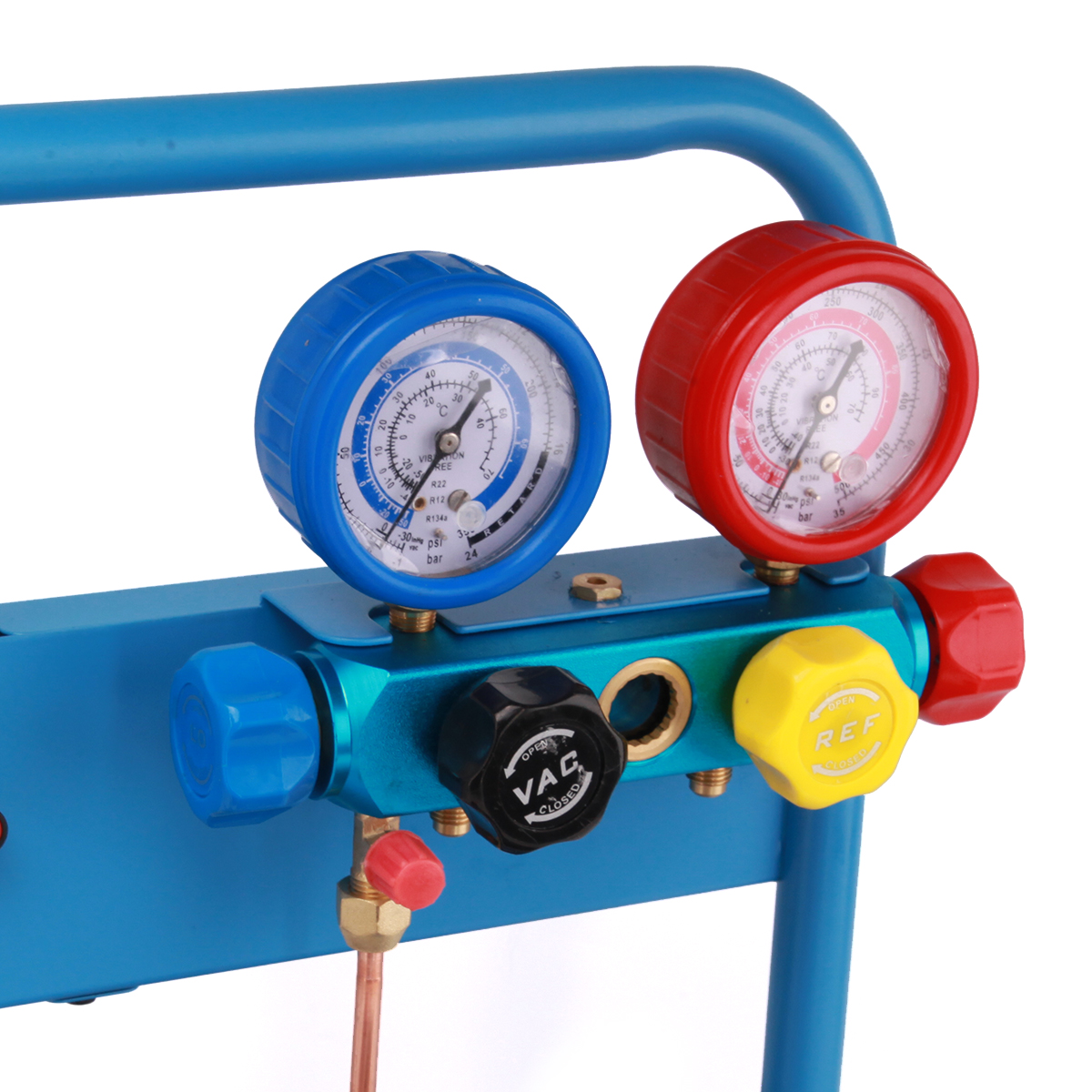 Установка создана на базе 4-х вентильного коллектора и одноступенчатого вакуумного насоса с производительностью 60 л/мин. В комплект также входят 4 заправочных шланга различной длины ( 3м - 2шт., 1,5м - 1шт., 0.5м - 1 шт.). Для удобства транспортировки и хранения все компоненты установки установлены на металлической раме.