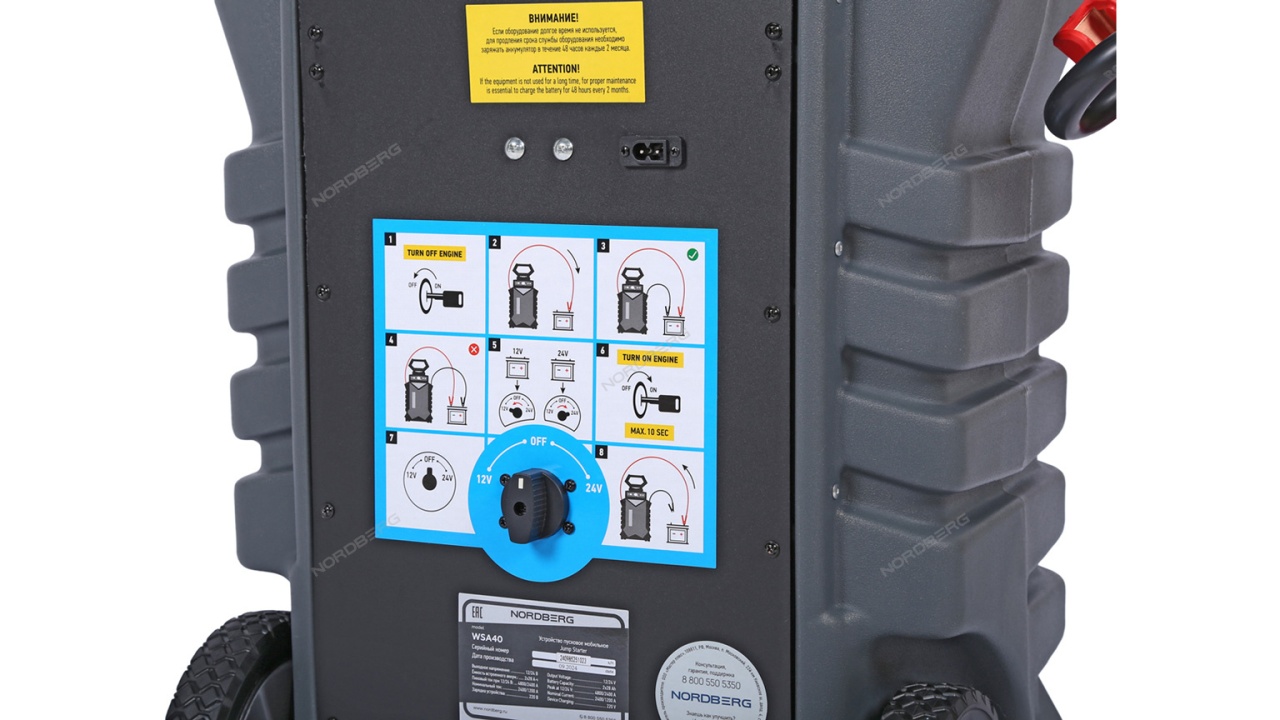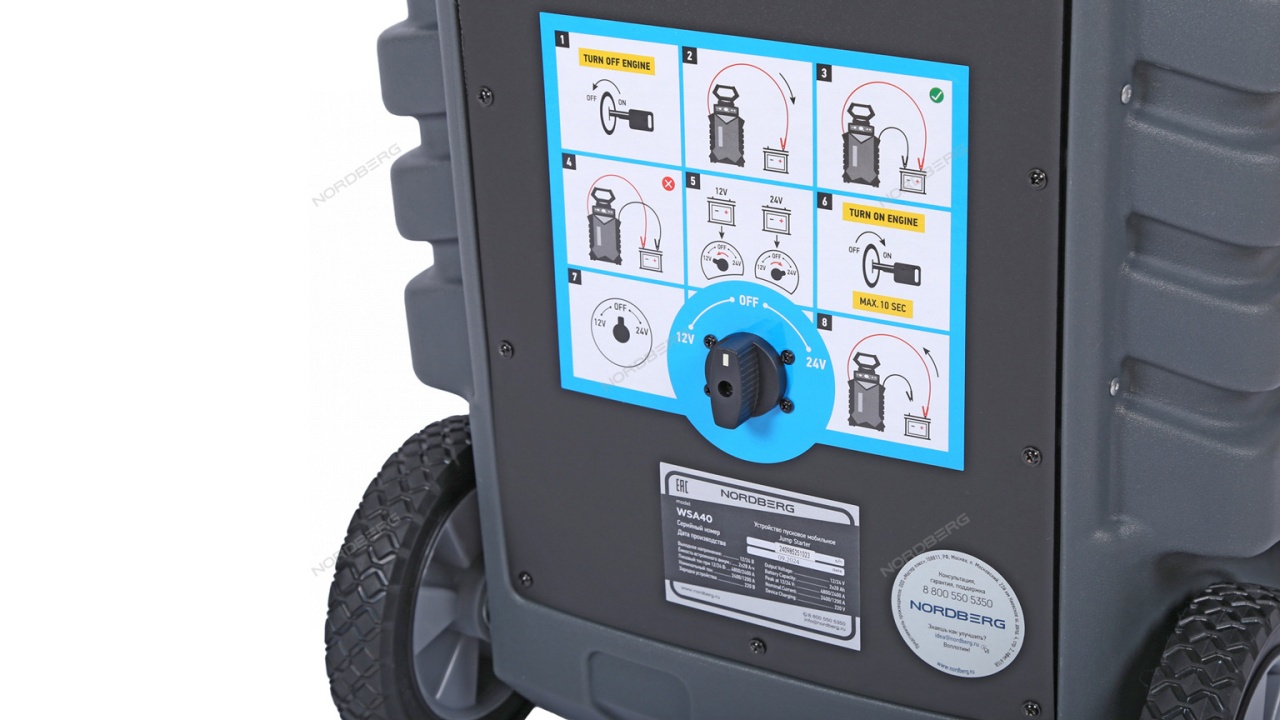 Пусковое портативное мобильное устройство NORDBERG WSA40 – компактная модель для запуска бензиновых и дизельных двигателей, а также зарядки аккумуляторных батарей.