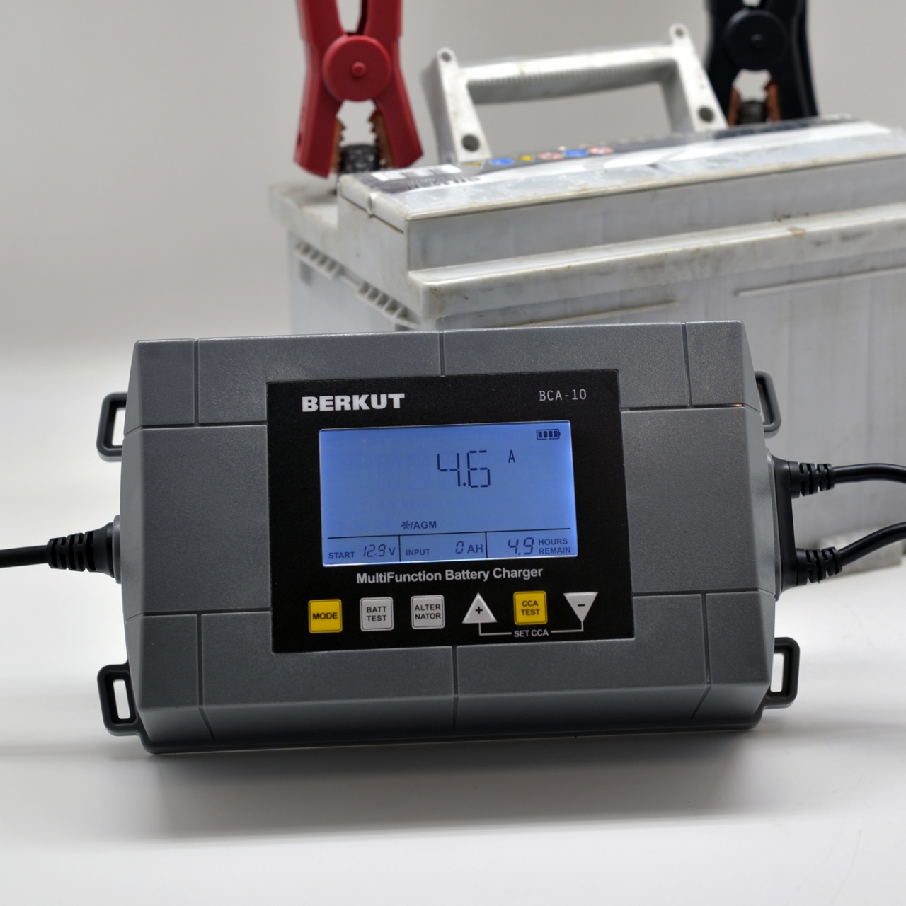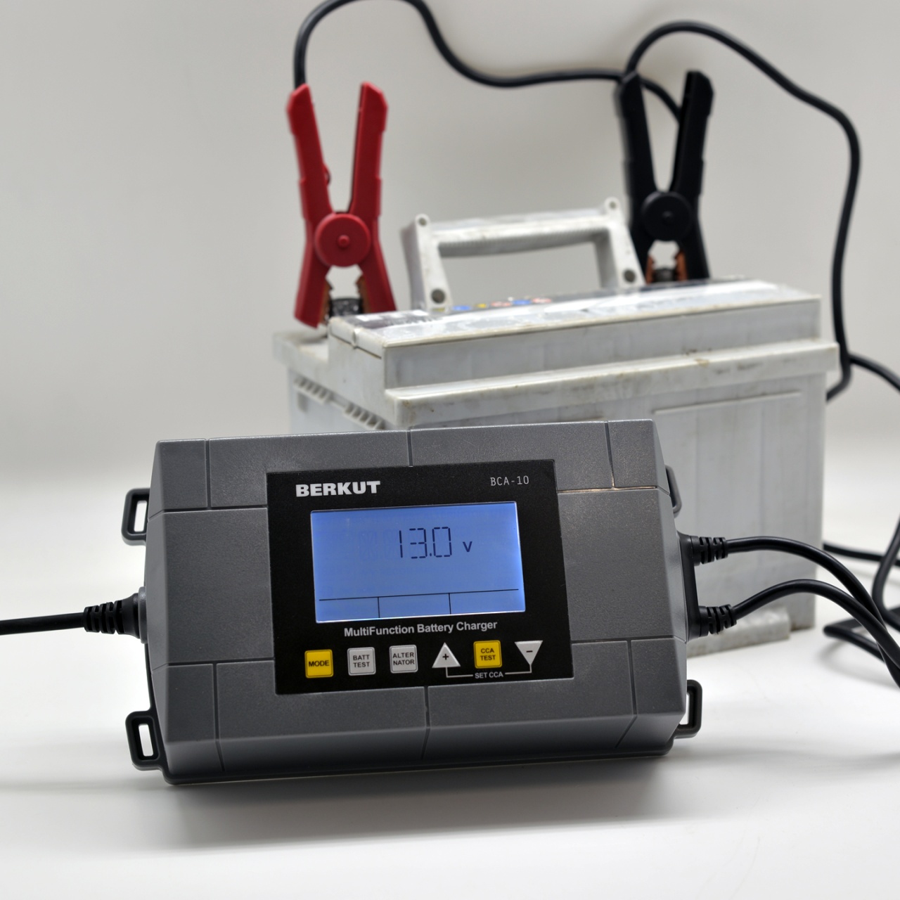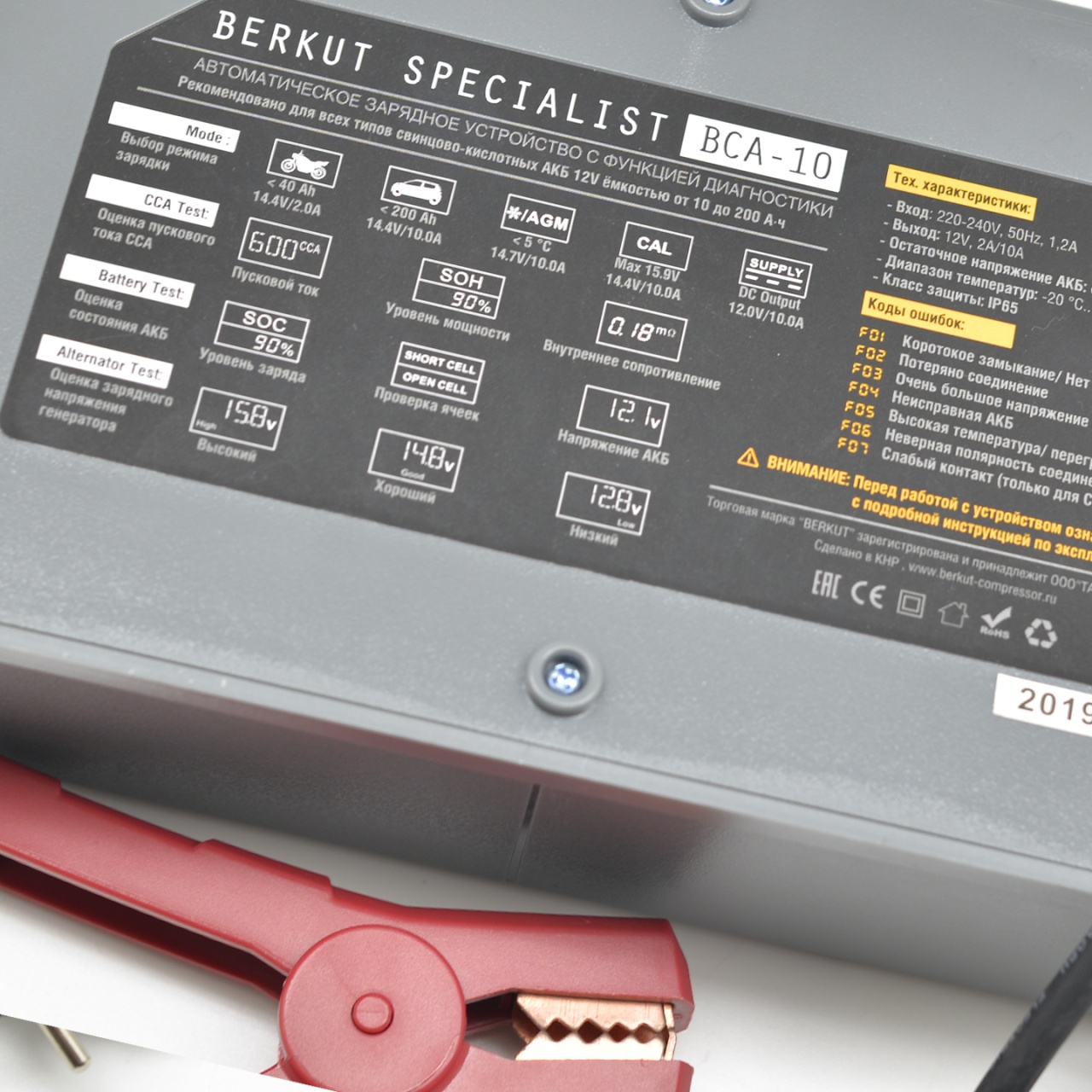 Зарядное устройство BERKUT BCA-10 — полностью автоматическое устройство, предназначенное для диагностики, зарядки, ухода и технического обслуживания всех типов свинцово-кислотных аккумуляторных батарей (Сa/Ca, MF, AGM, VRLA, GEL).