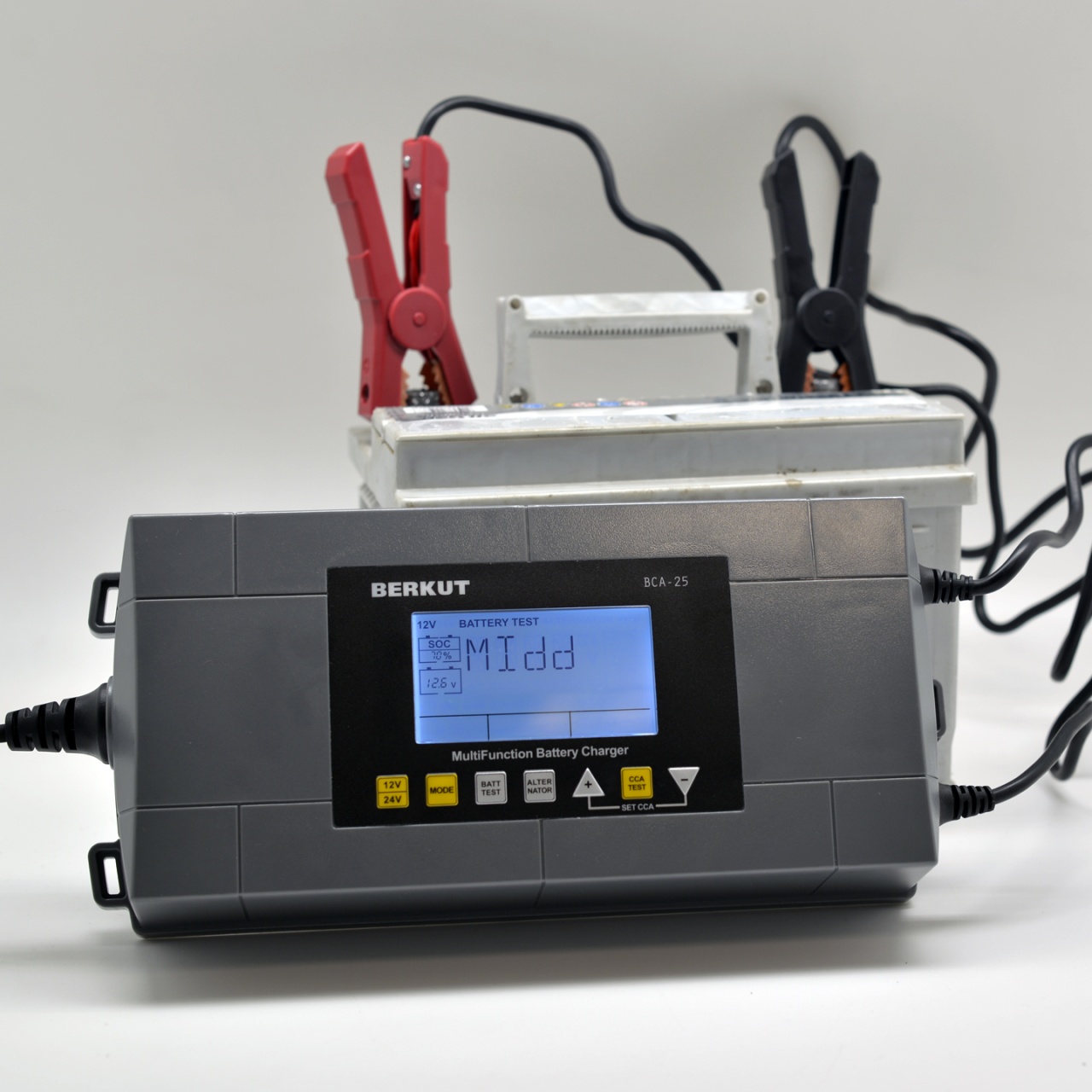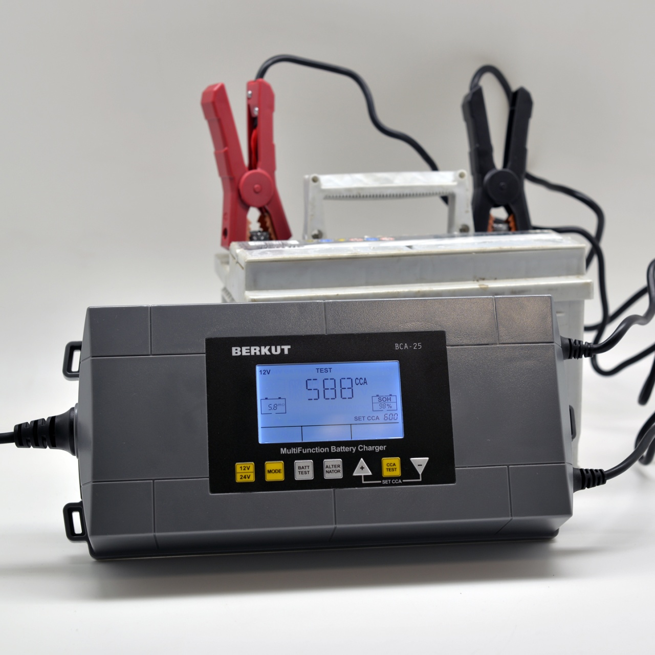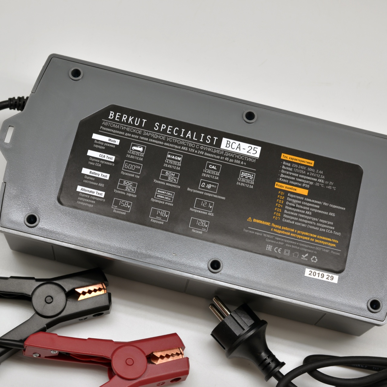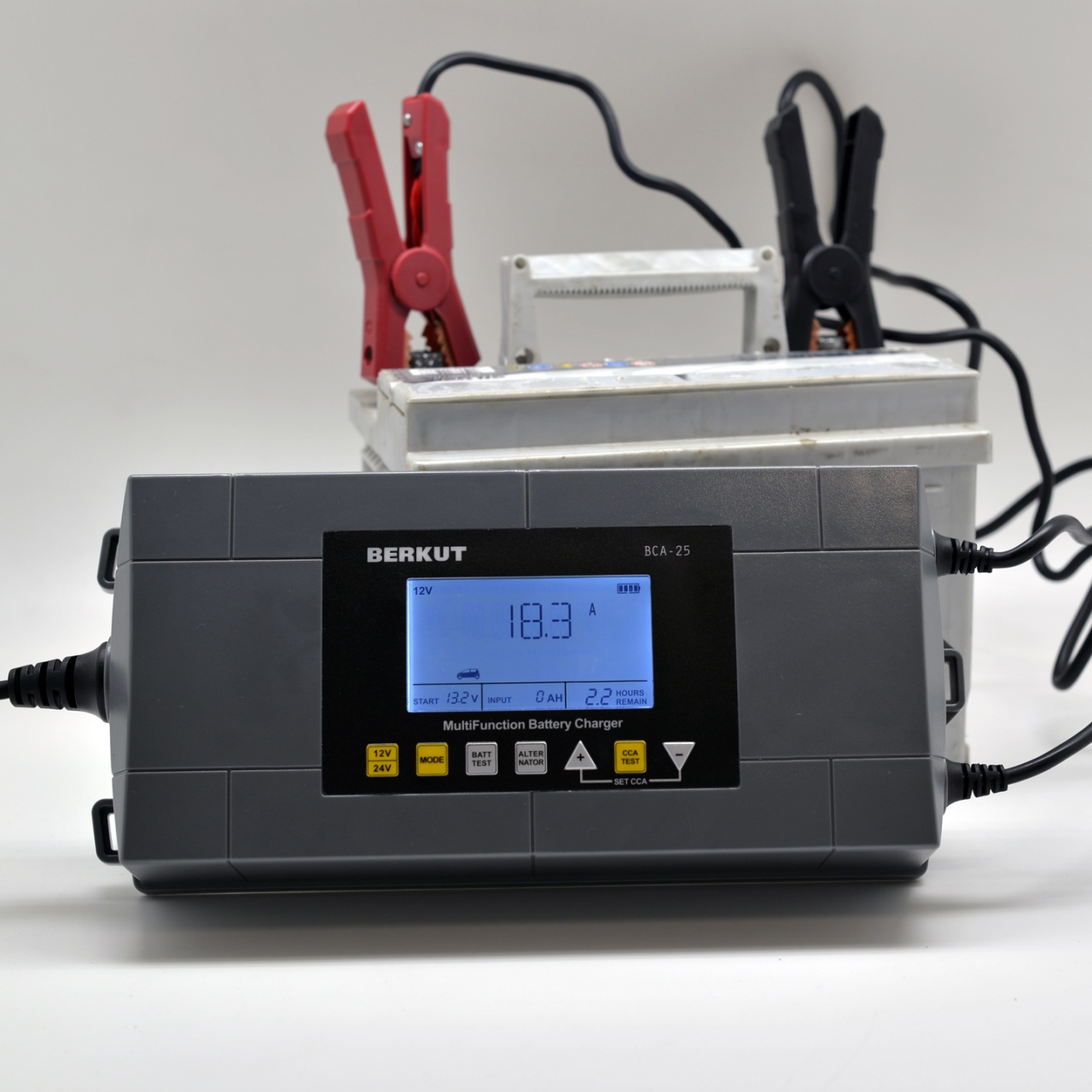 Зарядное устройство BERKUT BCA-25 — полностью автоматическое устройство, предназначенное для диагностики, зарядки, ухода и технического обслуживания всех типов свинцово-кислотных аккумуляторных батарей (Сa/Ca, MF, AGM, VRLA, GEL) с напряжением бортовой сети 12V и 24V.