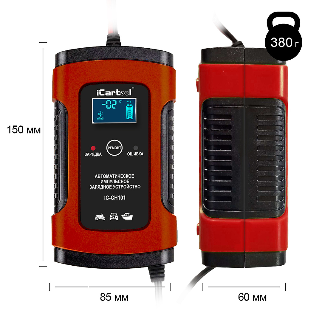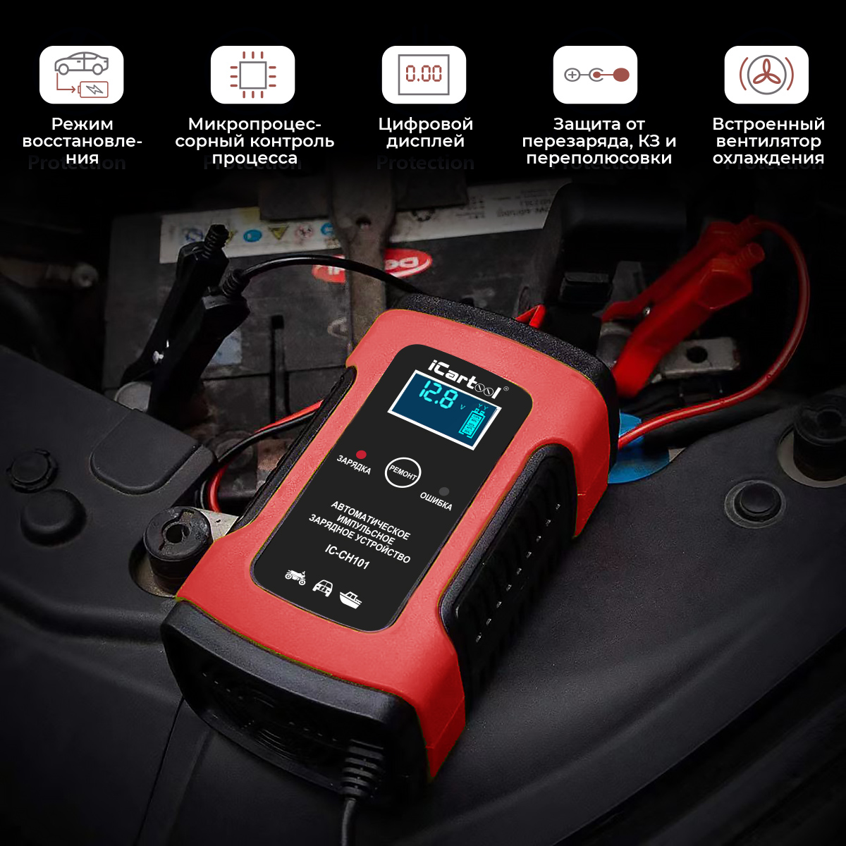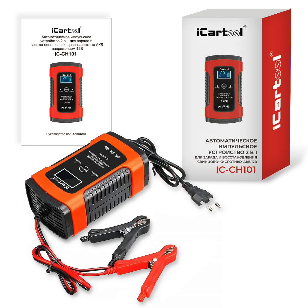 Автоматическое импульсное устройство 2 в 1 iCartool IC-CH101 предназначено для заряда и восстановления всех типов свинцово-кислотных аккумуляторных батарей (АКБ) напряжением 12В, включая АКБ типов AGM/GEL.