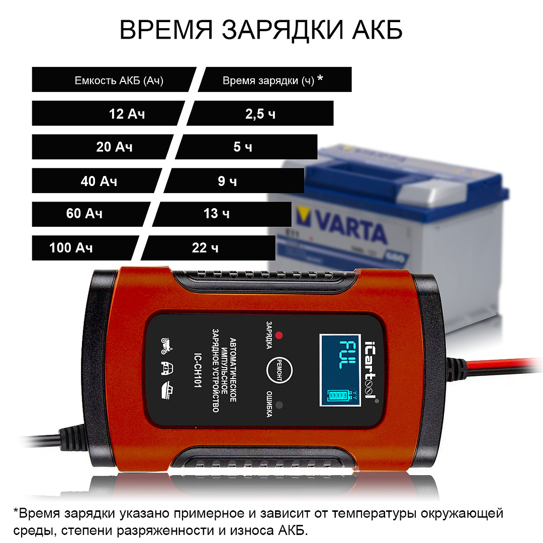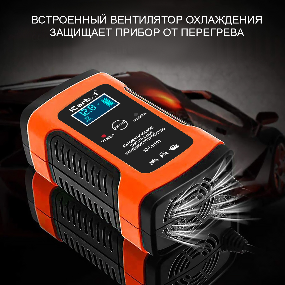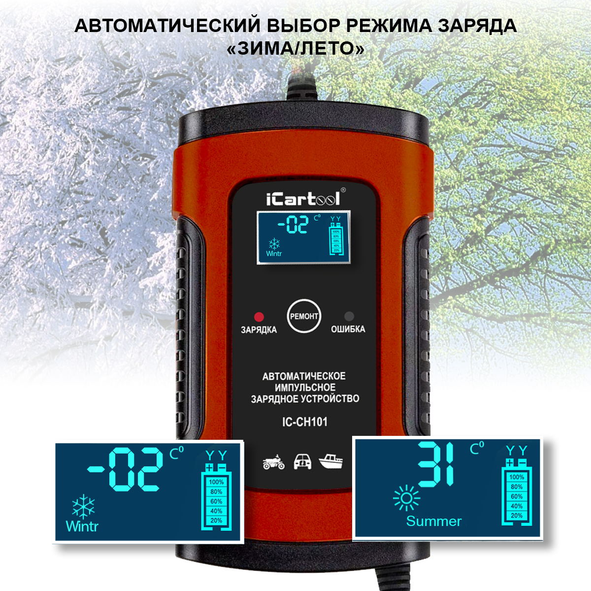 Автоматическое импульсное устройство 2 в 1 iCartool IC-CH101 предназначено для заряда и восстановления всех типов свинцово-кислотных аккумуляторных батарей (АКБ) напряжением 12В, включая АКБ типов AGM/GEL.