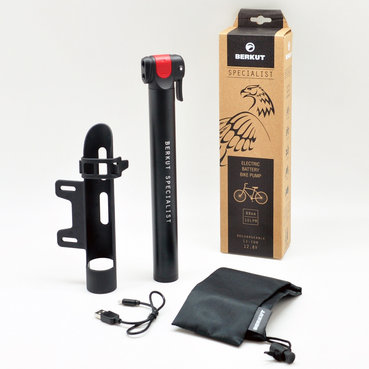 BERKUT VL-1050 — это переносной велокомпрессор серии BERKUT Specialist, который работает от встроенного аккумулятора. Зарядка аккумулятора осуществляется через разъем Micro USB 5V. Сцепление с ниппелем колеса происходит с помощью быстронакидкого наконечника с двумя выходами Schrader и Presta с одной стороны и фиксирующим рычажком с другой. Переносной электрический велонасос BERKUT Specialist VL-1050 комплектуются надежным креплением на раму.