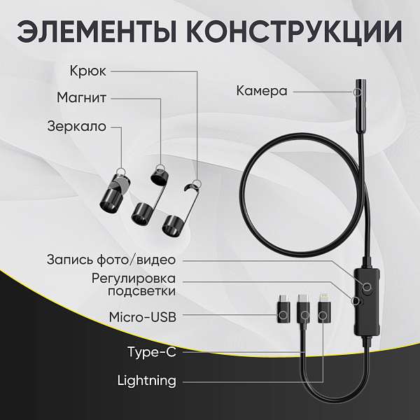 • В комплект входят вспомогательные насадки (крюк, магнит, зеркало), которые значительно расширяют функционал — что прекрасно подойдет для работы с электропроводкой и извлечения металлических предметов из труднодоступных мест.