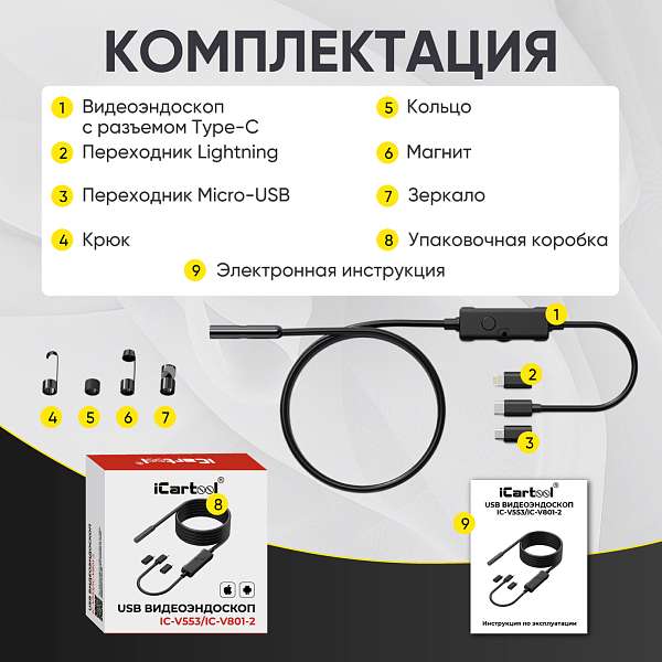 USB-эндоскоп для смартфона iCartool IC-V553 — это эффективный инструмент для профессионалов и любителей, позволяющий проводить осмотр скрытых участков и недоступных для прямого обзора зон.