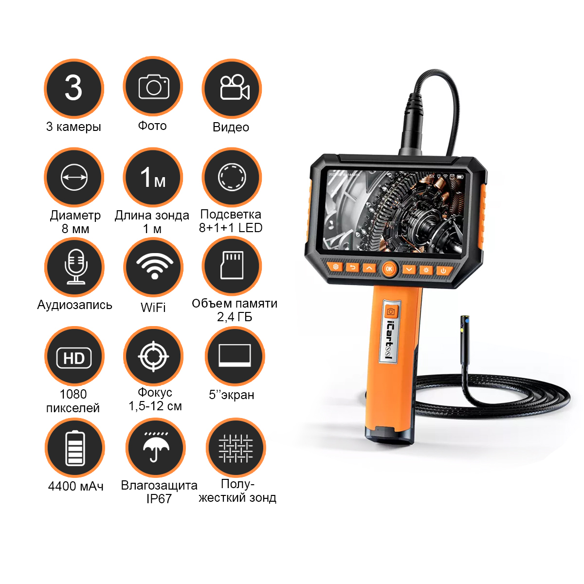 Промышленный видеоэндоскоп iCartool IC-V116A - новый вид эндоскопа, который оснащен сразу 3 видеокамерами, большим информативным дисплеем, модулем Wi-Fi и микрофоном. Экран с диагональю 5" и технологией IPS имеет удобный интерфейс и воспроизводит изображения в отличном качестве HD.