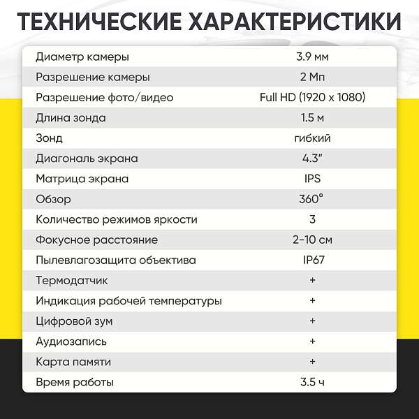 • Камера: диаметр 3.9 мм, разрешение 2 Мп