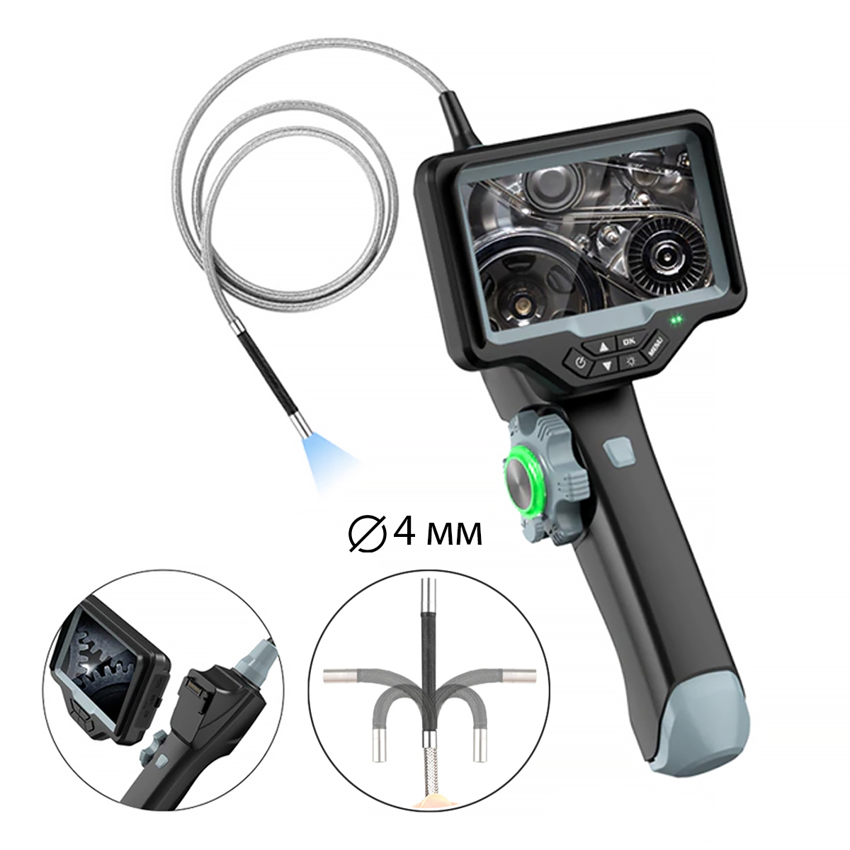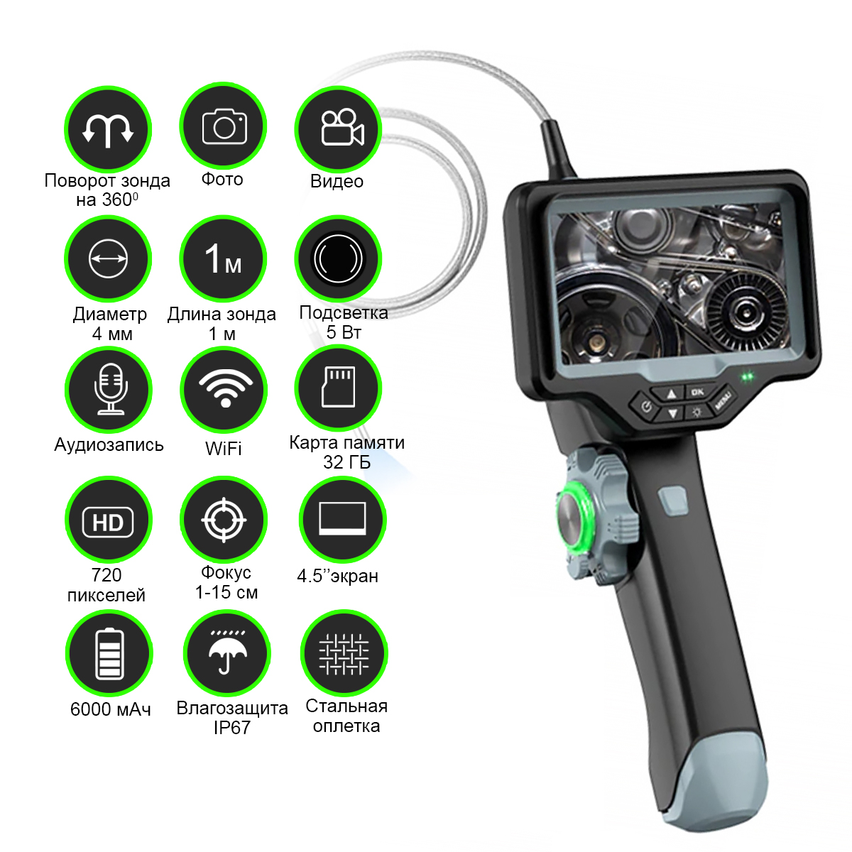 Эндоскоп обладает поворотной камерой на 360°, большим защищенным экраном диагональю 4,5”, позволяет делать аудиозапись во время съемки и передавать изображения посредством Wi-Fi соединения на устройства с ОС IOS / Android.