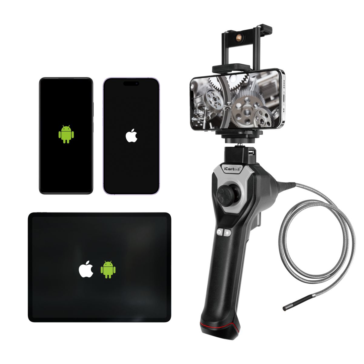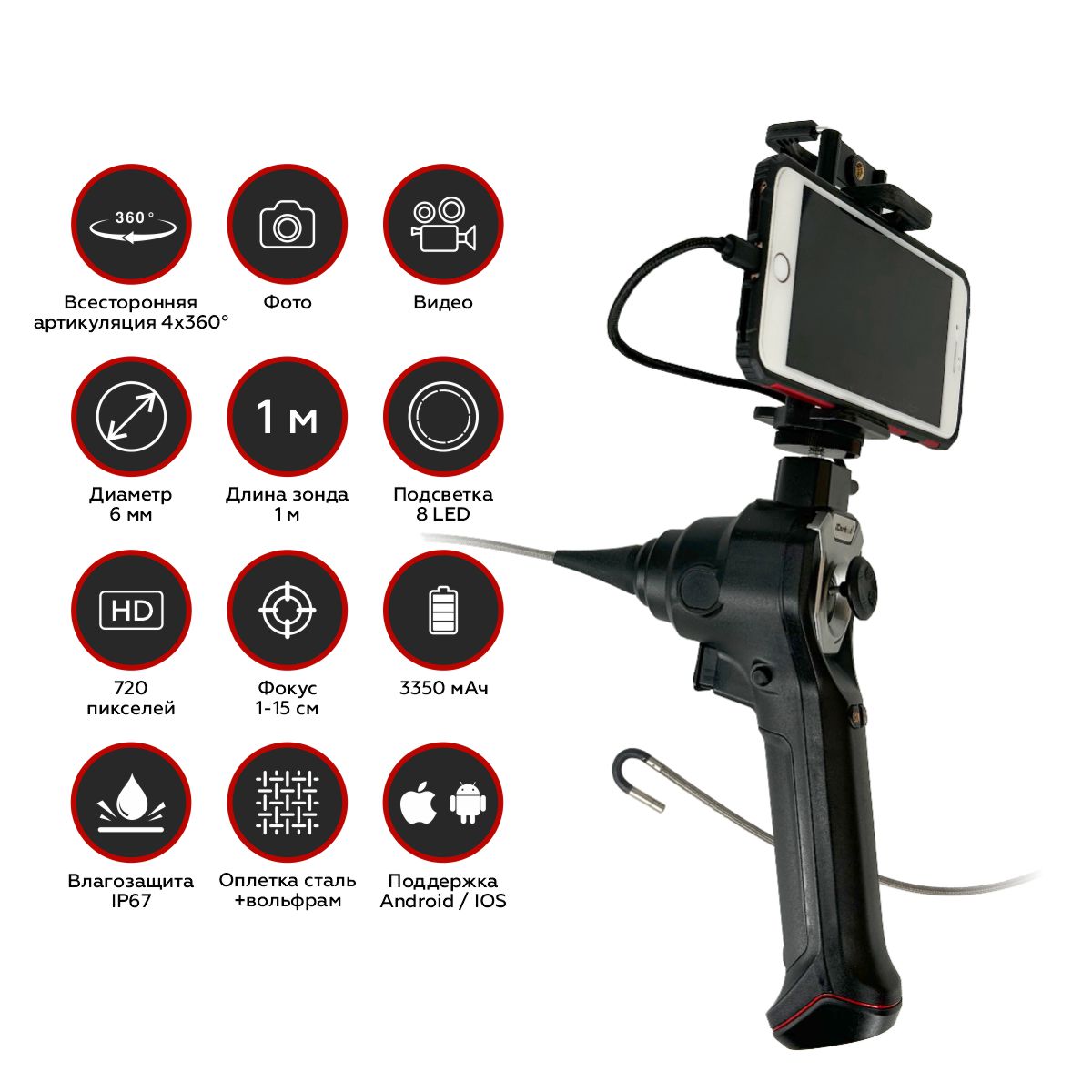 Камера с разрешением 1 Мп имеет автоматическую фокусировку в диапазоне от 1 см. Для работы в темных местах предусмотрена регулируемая LED подсветка с 3 уровнями яркости. Корпус эндоскопа легкий, удобно лежит в руке, оснащен собственным аккумулятором для продолжительной работы. Держатель смартфона съемный, имеет 2 варианта крепления к корпусу (вертикально и горизонтально) и надежно удерживает мобильное устройство (телефон/планшет) шириной до 18 см.