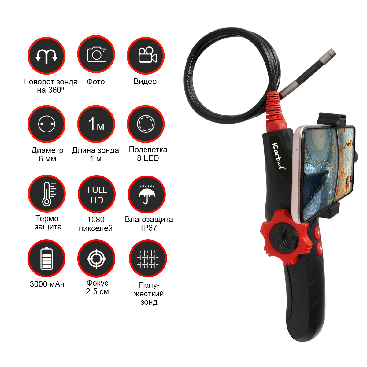 iCartool IC-V200 управляемый видеоэндоскоп с поворотной камерой на 360°. Удобный механизм управления камерой расположен на рукоятке прибора, позволяет плавно регулировать положение головки зонда и фиксировать его изгиб. Камера с разрешением 2 Мп и автоматической фокусировкой обеспечивает качественную прорисовку исследуемых труднодоступных полостей. Для работы в темных местах предусмотрена регулируемая LED подсветка с 3-мя уровнями яркости.