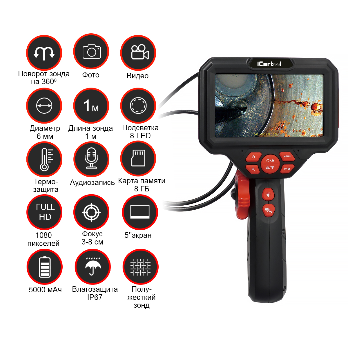 iCartool IC-V200C управляемый видеоэндоскоп-трансформер с возможностью подключения внешнего устройства: смартфона, планшета или ПК. Оснащен съемным цветным IPS экраном с диагональю 5”. Удобный механизм управления камерой расположен на рукоятке прибора и позволяет фиксировать изгиб зонда в любом положении.