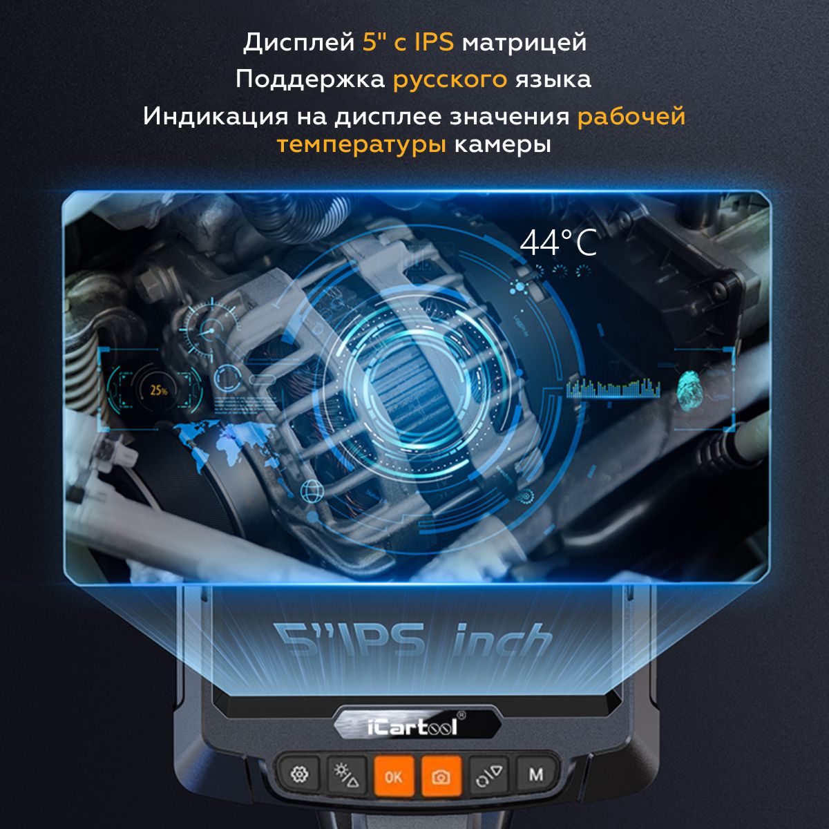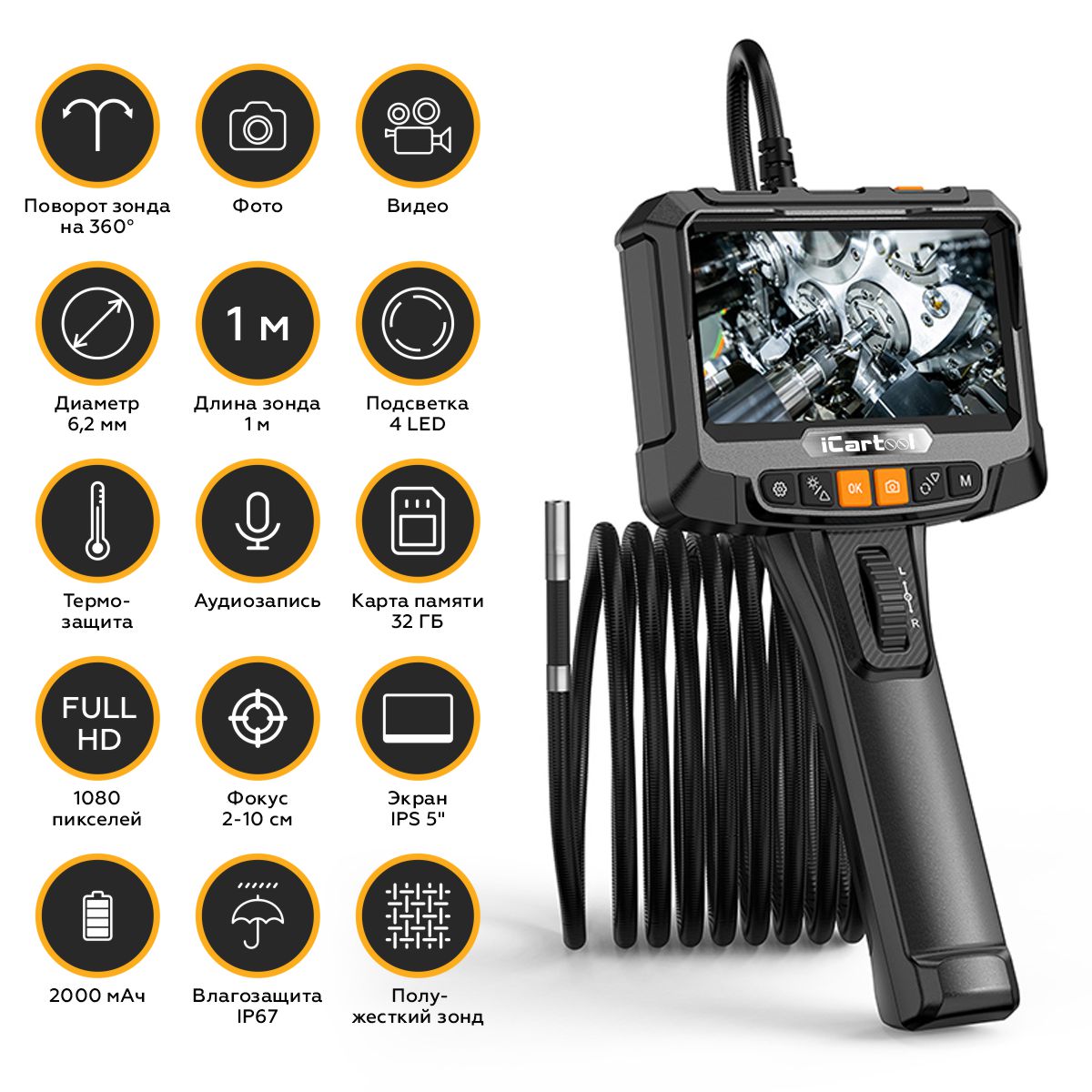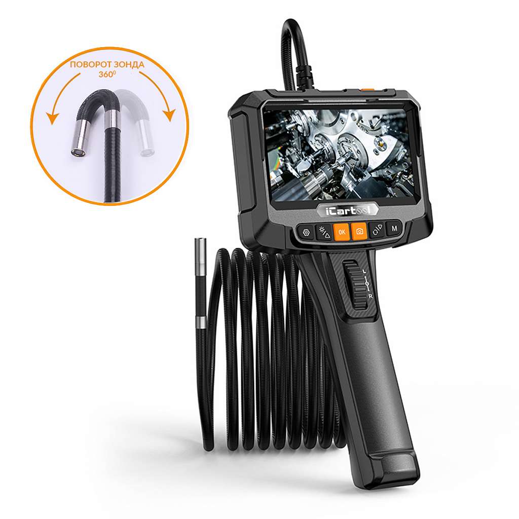 iCartool IC-VC8052W управляемый видеоэндоскоп с поворотной камерой на 360° и цветным дисплеем диагональю 5”. Экран с IPS матрицей имеет удобный интерфейс и воспроизводит изображения в качестве HD. Камера разрешением 2 Мп с широким углом обзора 70° обеспечивают качественную картинку, а цифровой зум помогает рассмотреть мелкие детали.