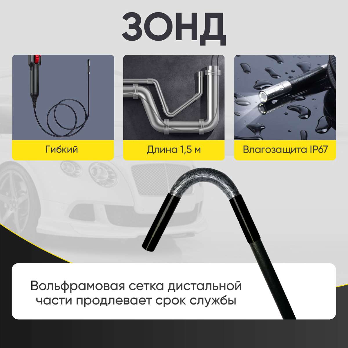 iCartool IC-V201 - автомобильный управляемый видеоэндоскоп с поворотной камерой на 360° и зондом малого диаметра. Механизм управления камерой расположен внутри рукоятки прибора и позволяет плавно регулировать положение камеры при осмотре слепых зон. Зонд прибора гибкий, имеет длину 1,5 м и защиту IP67. Диаметр камеры 5,5 мм идеален для решения всего спектра задач в автодиагностике. Разрешение матрицы камеры в 2 Мп формирует качественное изображение и передает его на смартфон посредством USB-соединения. В комплект входят 2 кабеля при помощи которых можно подключиться к устройствам с ОС Android или iOS. Яркая LED-подсветка из 6 светодиодов позволяет делать снимки или видео с насыщенным цветом даже в плохо освещенных местах.
