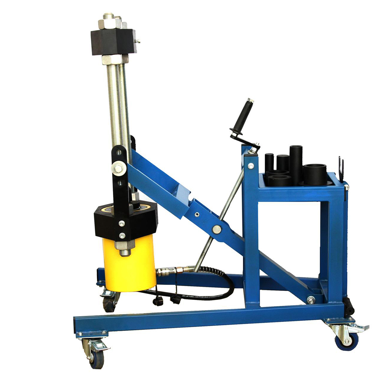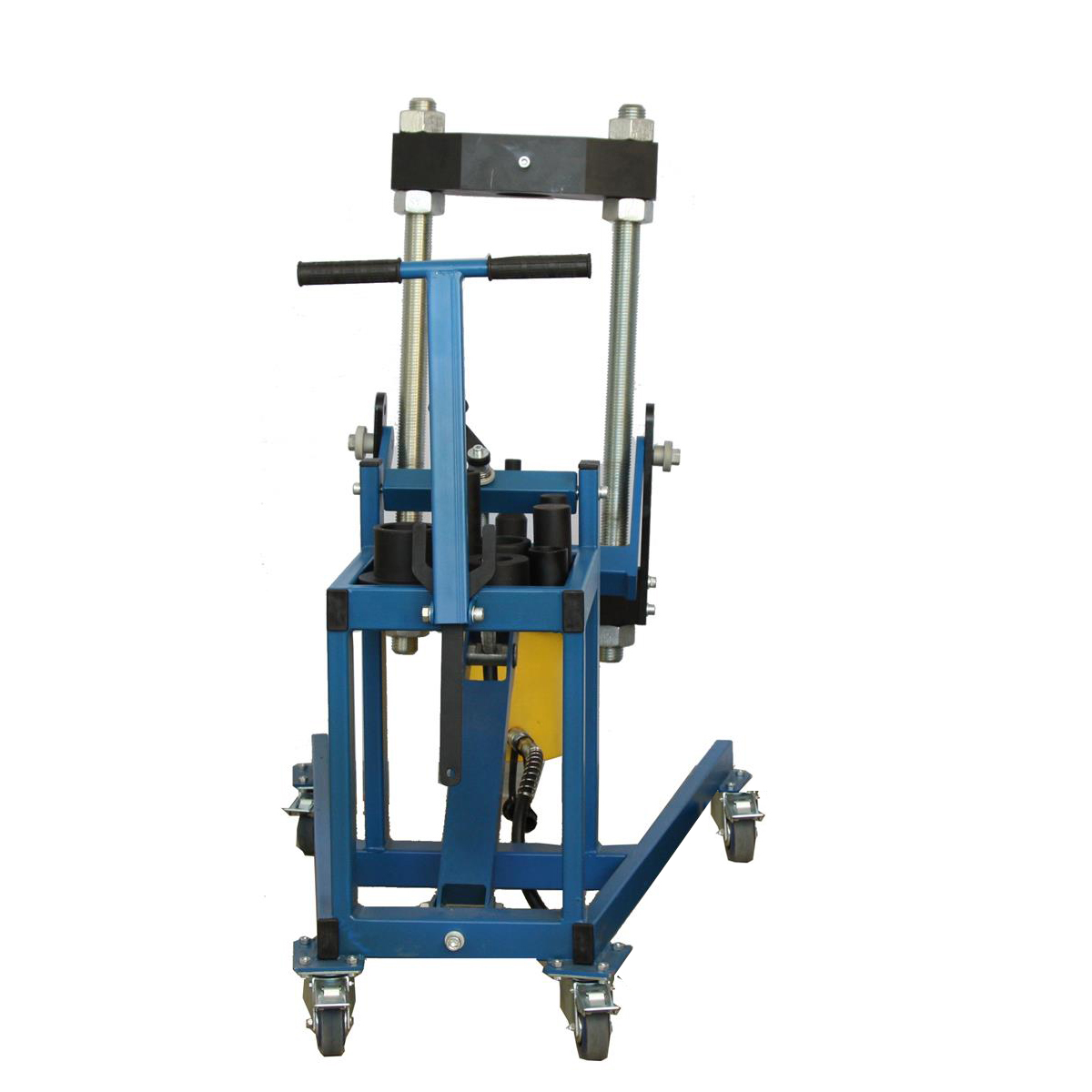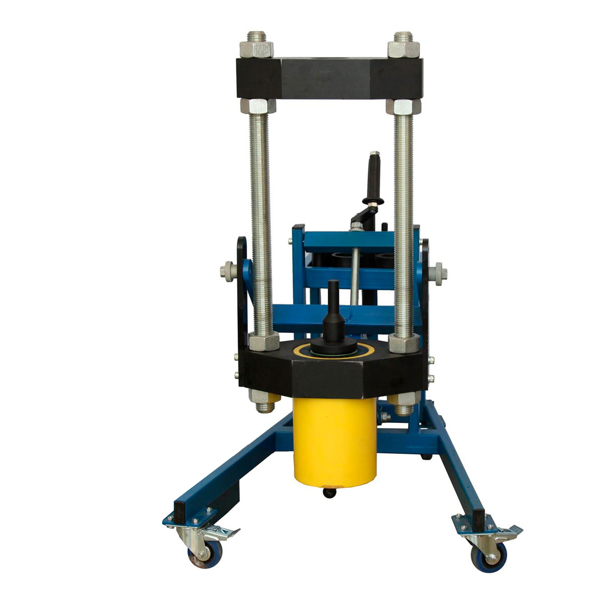 Пресс оснащен тележкой, которая позволяет быстро и легко расположить агрегат в колесной нише автомобиля. В комплект входит полный набор адаптеров для запрессовки и выпрессовки шкворня.